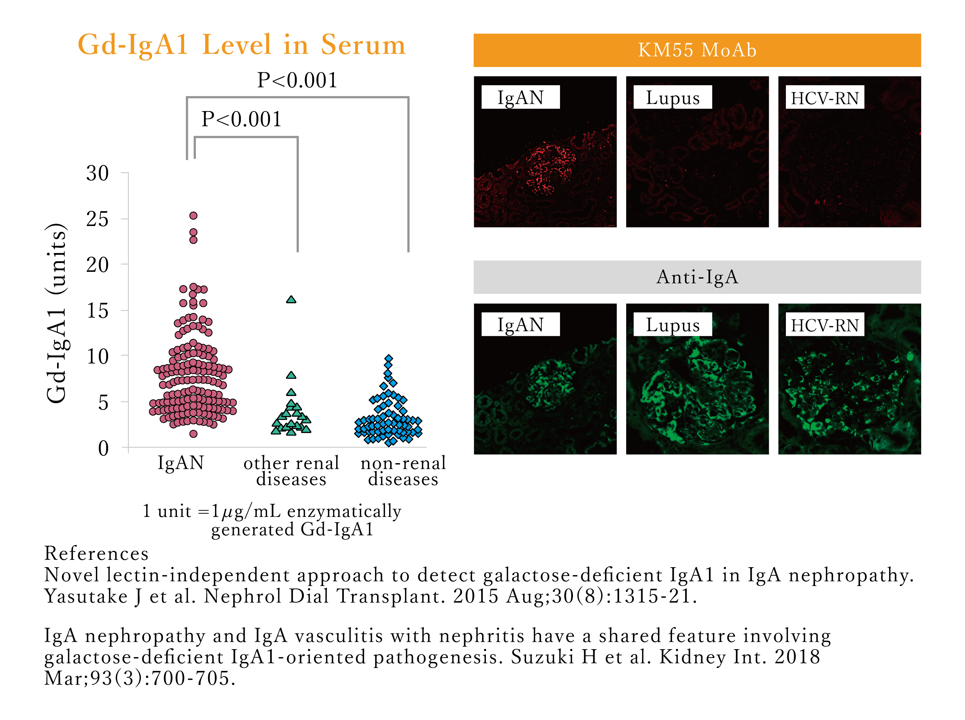 Galactose-deficient IgA1 (Gd-IgA1)attracts a lot of attention as a critical effector molecule in the pathogenesis and progression of IgA Nephropathy (IgAN) in recent research.The IBL ELISA kit, using a monoclonal antibody (KM55) that specifically recognizes the galactose-deficient hinge sequence of human Gd-IgA1, is a lectin non-dependent measuring system that can quantitatively measure Gd-IgA1 in human serum. It is also suitable for large scale studies because of its stability. #27600 Human Gd-IgA1 ELISA specifically detects human Gd-IgA1 and #10777 Gd-IgA1 (KM55) MoAb can be used for IHC.