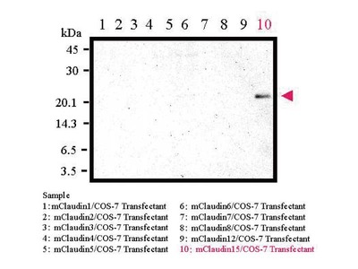 | 特異性 | Claudin-12に特異的。Claudin-1, -2, -3, -4, -5, -6, -7, -8, -15とは反応しません。 (Transfectantを用いたウエスタン・ブロッティングにて確認) |
